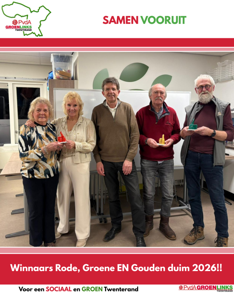 Op woensdag 11 maart zijn door PvdA-GroenLinks Twenterand de Rode en Groene duim uitgereikt voor sociale en duurzame initiatieven die er toe doen in Twenterand. Dit gebeurde in basisschool CBS De Bron in samenwerking met Buurthuis Westerdok